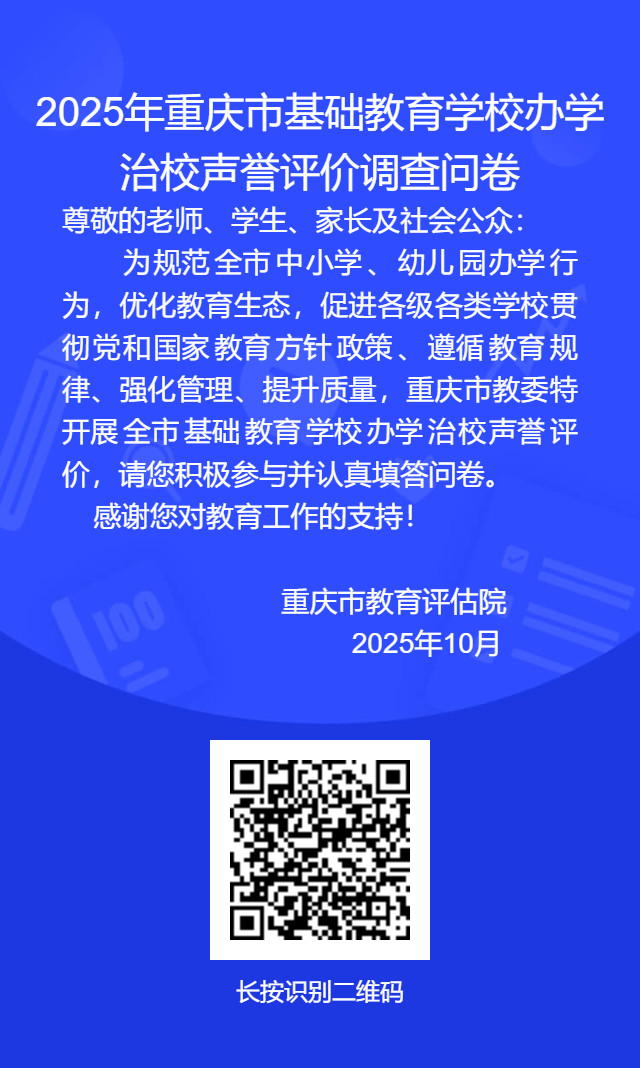 轉(zhuǎn)發(fā):重慶市長(zhǎng)壽區(qū)教師發(fā)展中心 關(guān)于開(kāi)展2025年基礎(chǔ)教育學(xué)校辦學(xué)治校 聲譽(yù)評(píng)價(jià)問(wèn)卷調(diào)查工作的通知